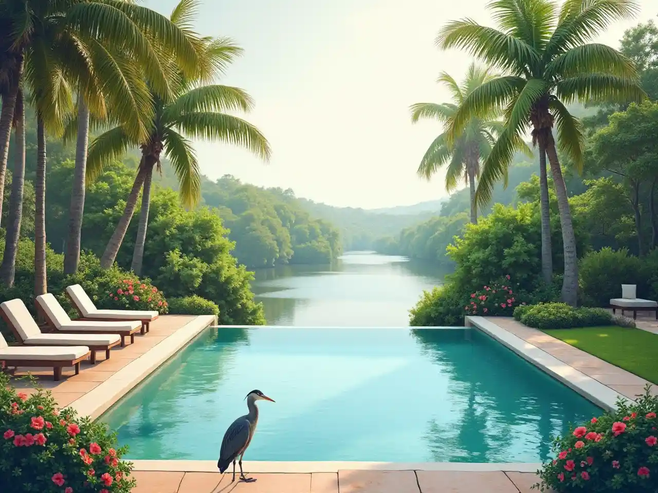A serene poolside scene unfolds along a calm waterway, framed by lush palm trees swaying slightly in a gentle breeze. The infinity pool, with its crystal-clear water, appears to merge seamlessly with the river, providing a picturesque view of the greenery beyond. Flanking the pool are neatly manicured bushes adorned with vibrant flowers, while comfortable lounge chairs invite relaxation. A distant heron stands on the edge of the lower deck, adding a touch of wildlife to the tranquil environment, all under a slightly overcast sky that hints at a soft, diffused light throughout the landscape, creating a peaceful, inviting atmosphere. Make it a watercolor. Add festive decorations for cocktail party. Make it at sunset.