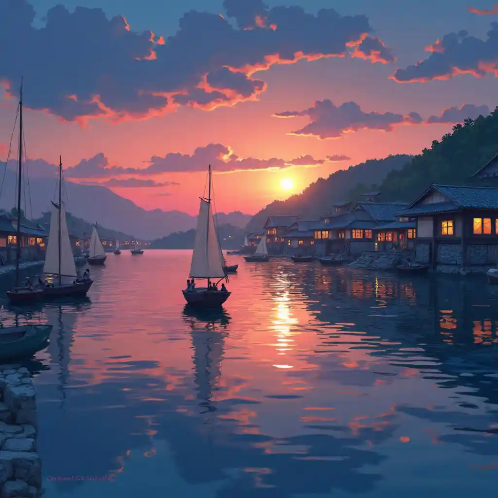 Seaside town at dusk, lantern boats setting sail, echoing serene slice-of-life anime aesthetics.