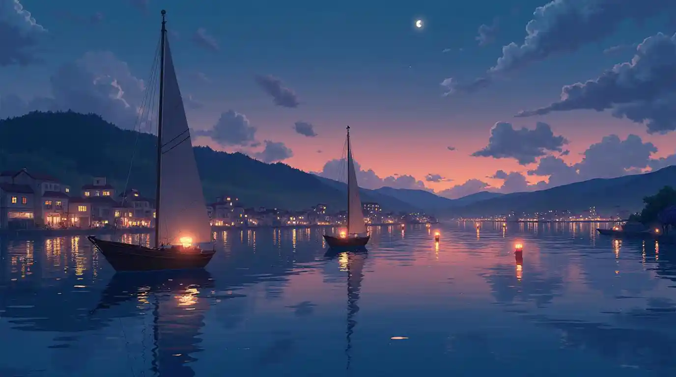 Seaside town at dusk, lantern boats setting sail, echoing serene slice-of-life anime aesthetics.