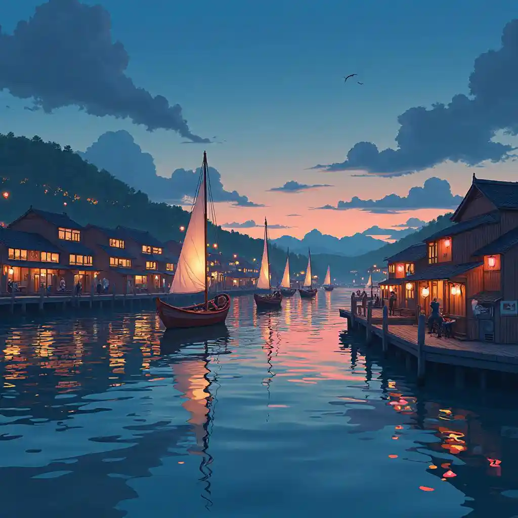 Seaside town at dusk, lantern boats setting sail, echoing serene slice-of-life anime aesthetics.