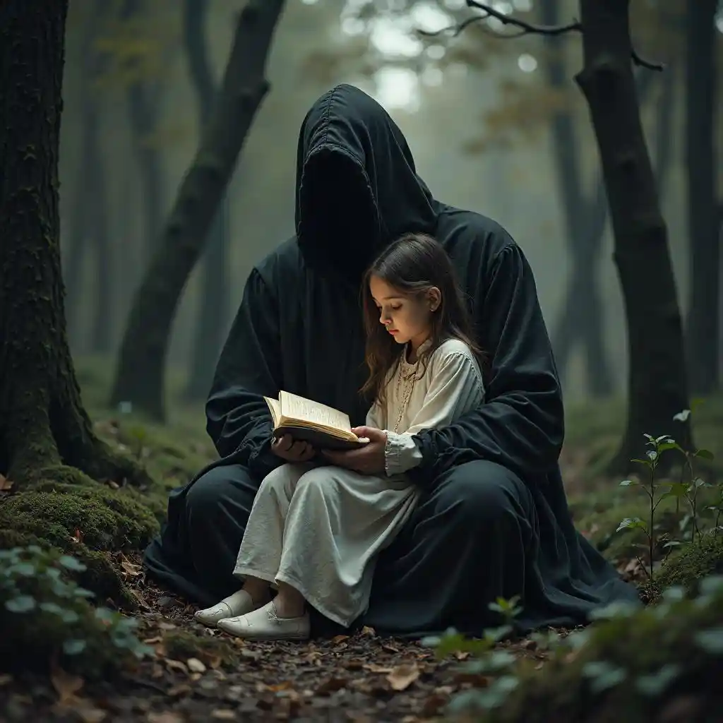 A girl in white clothes is reading a book in the forest and a man of shadow and darkness is holding her in his arms
