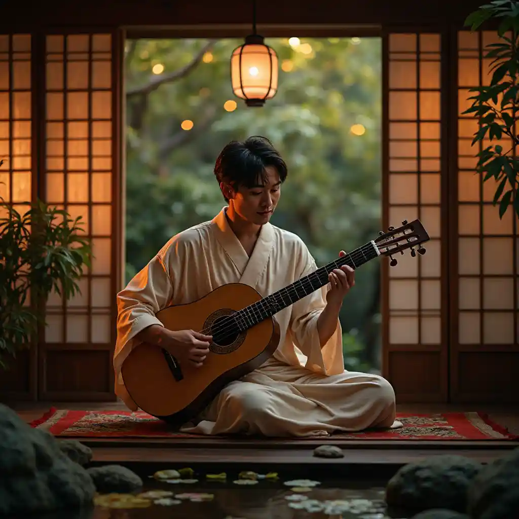 Playing a shamisen in a lantern-lit teahouse, a White man in his 20s glows in a silk kimono. Bamboo screens and koi ponds frame him, his soulful melodies and serene focus exuding cultural depth and tranquil charm in an intimate, traditional setting.