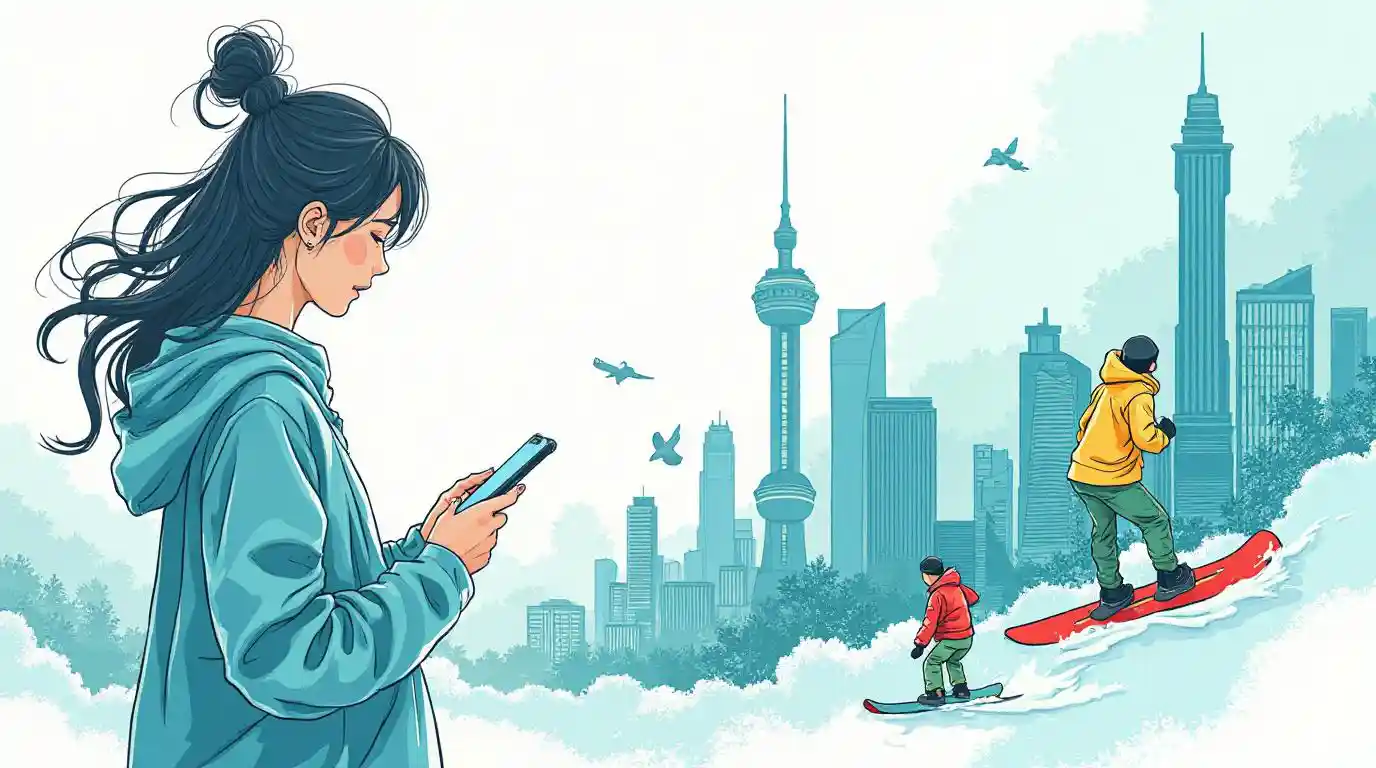 Delicate line drawing illustration with blue-green gradient, white background, botanical clouds, close-up of young Chinese woman holding a mobile phone, the camera shows iconic buildings in Shanghai (skyscrapers, hypermarkets, shopping malls, characters surfing and skiing), side view angle, the background is integrated with the characters surfing and skiing and skyscrapers, the main colours are gradient of blue-green, embellished with red, yellow, and green, abstract art style, futuristic technology, high contrast, abstract, abstract, abstract, abstract, abstract, abstract, abstract, abstract, abstract, abstract, abstract, abstract, abstract, abstract, abstract, abstract, abstract, abstract, abstract, abstract, abstract, abstract, abstract.Fine lines, soft light, surreal, dreamy, innovative.