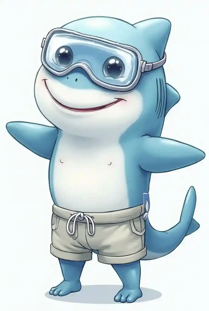 ElsaSemi realistic Cute chibi shark wearing beach trouser and transparent swimming googles with seaartai logo on its chest concept art with multiple views white bac