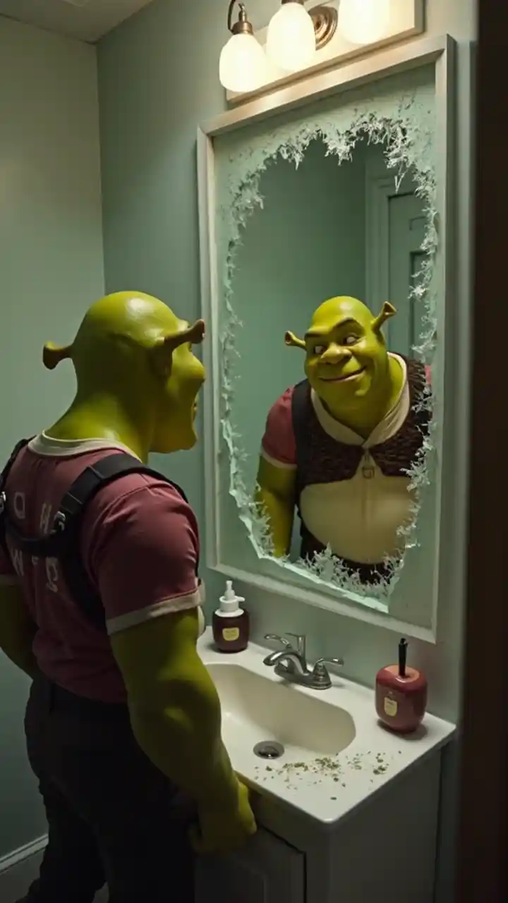 Shrek looks in a broken mirror while wearing a T-Mobile uniform in a bathroom.