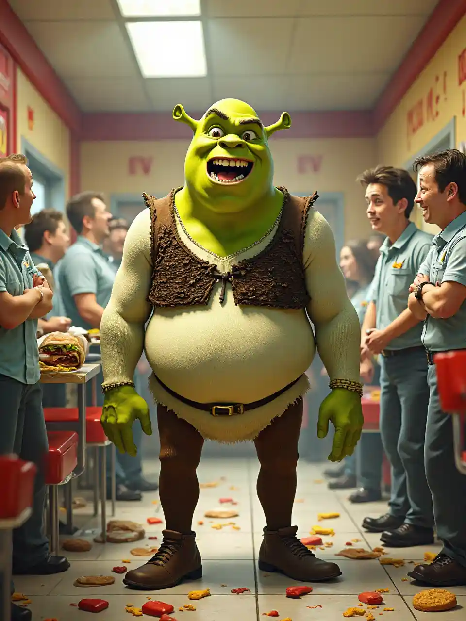 Illustrative image of Shrek standing in a messy McDonald's restaurant with surprised employees and scattered food.
