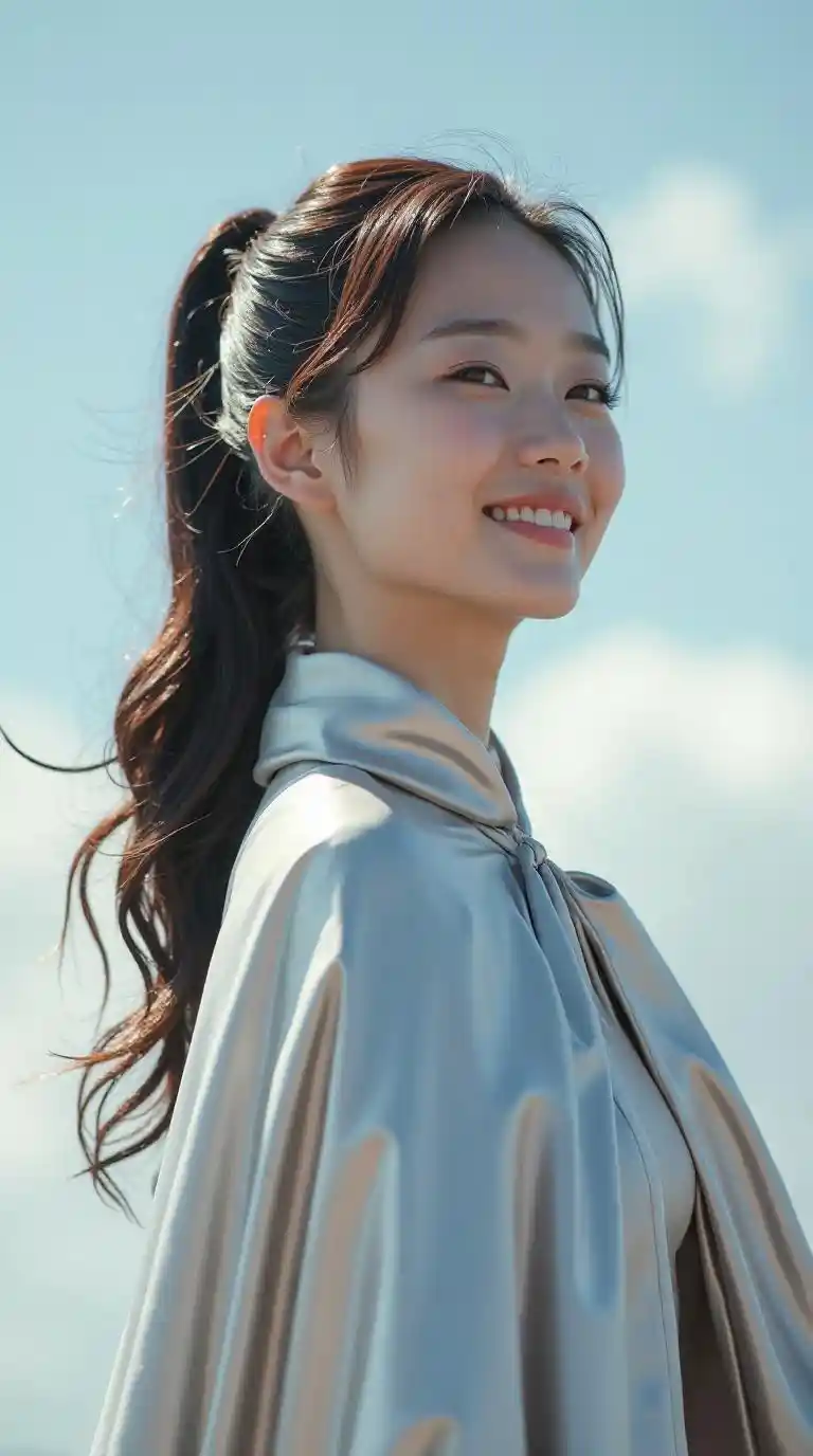ankle length high collar shiny silver cape tied at the neck:1.20, ((delicate and beautiful:1.10)) , ((perfect face :1.1)) , (detailed eyes:1.10), beautiful smiling young chinese woman , long hair with highlights in ponytail , silver leotard, floating in the sky , RAW Photo , full colour , best quality , HDR , photographic , realism pushed to extreme , fine texture , ultrarealistic, film grain , full length , 8K documentary film still