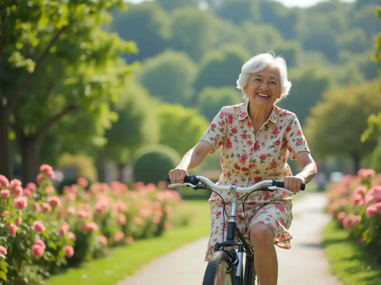 Riding a bike in a sunlit park, a 77-year-old East Asian woman with silver hair wears a dress with flower patches. Blooming roses and green hills frame her, her steady pedaling radiating playfulness and sunny joy in a serene, urban scene. Her laughter brightens the day.