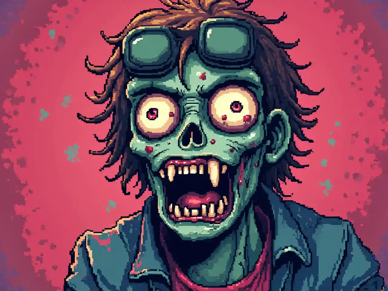 pixel art of 90s Skate Punk gross out art featuring an illustration of a zombie with his eyes bulging out.