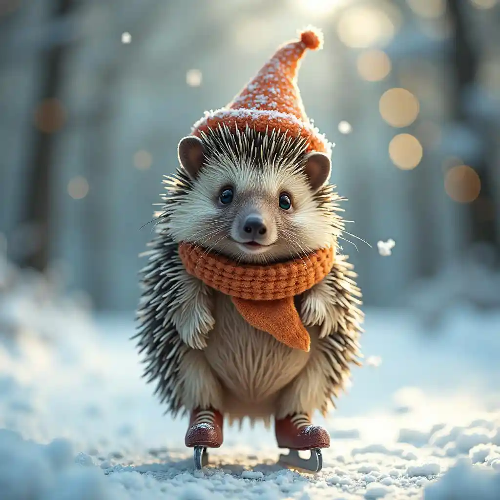 BentleyA hedgehog on ice skates, wearing a funny hat and scarf skates on ice skates, with a fairy-tale atmosphere around him