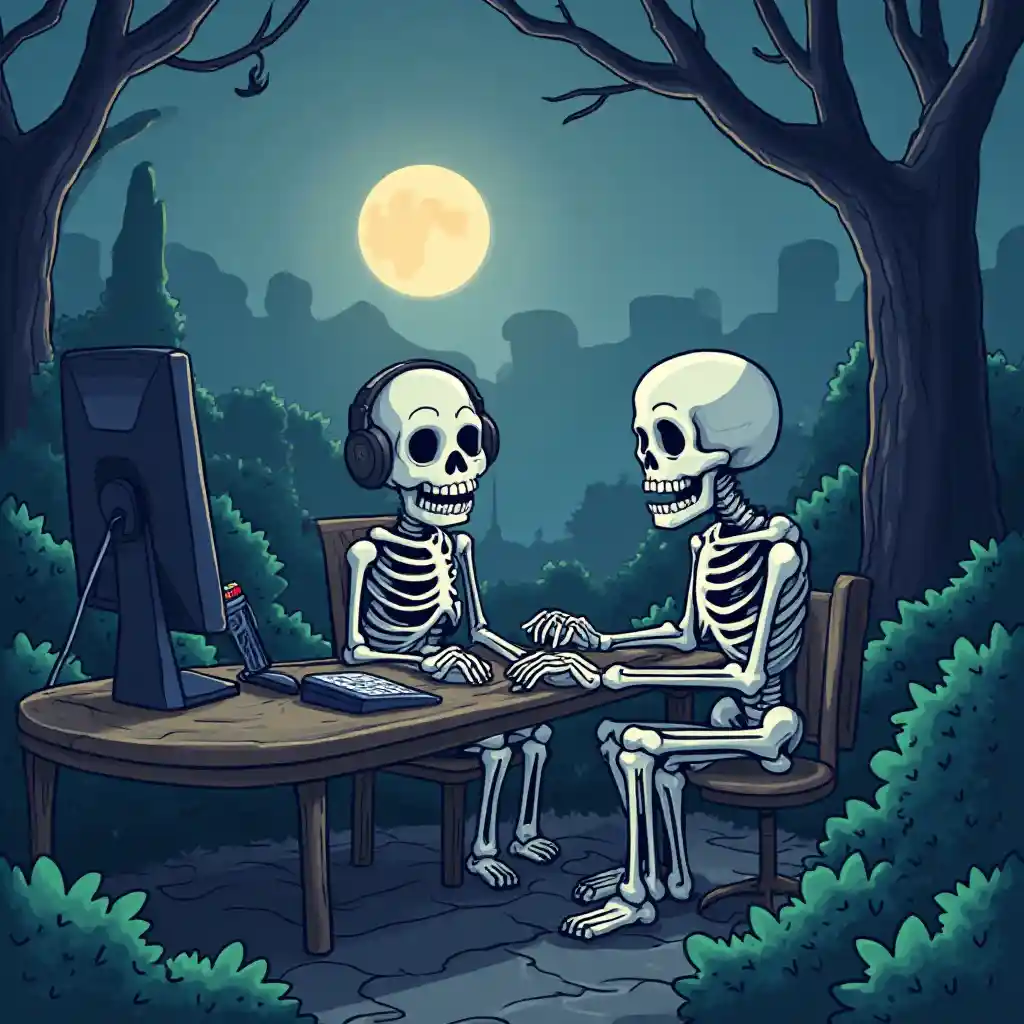 Cartoon Skeletons Playing Video Games in a Graveyard