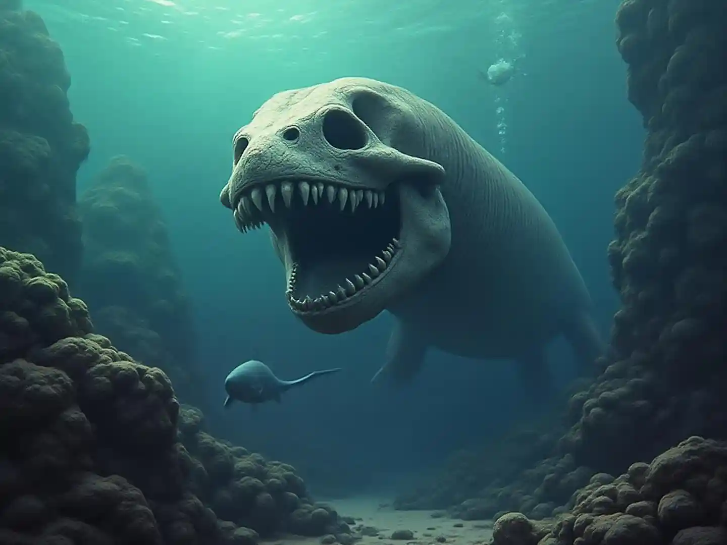 show me a bone skull seaship, underwater, a lot of sharks are around