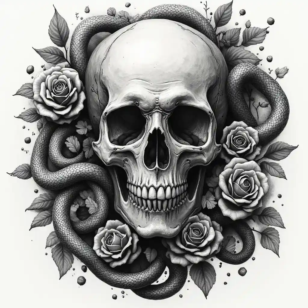 Bettya black and white image with a skull and faded roses of snakes circling around