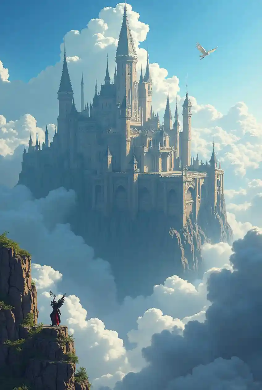 Majestic fortress in the clouds, winged guards patrolling, reminiscent of celestial anime settings.