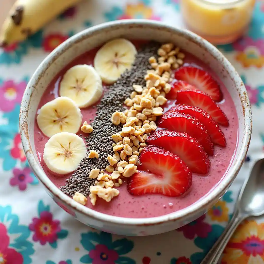 A vibrant smoothie bowl made with strawberries and bananas, topped with granola, sliced fruits, and chia seeds. The bowl is placed on a colorful tablecloth with a spoon beside it. The scene is bright and cheerful, highlighting a healthy breakfast option
