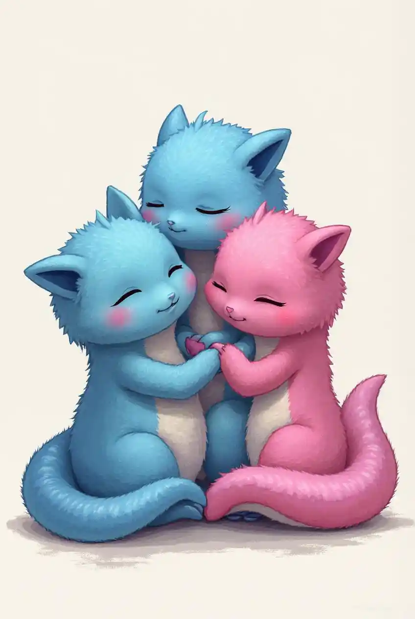 The image is a digital artwork featuring three cute fluffy anthropomorphized creatures with blue and pink skin, resembling a combination of a human and a snake, hugging each other in a serene manner.