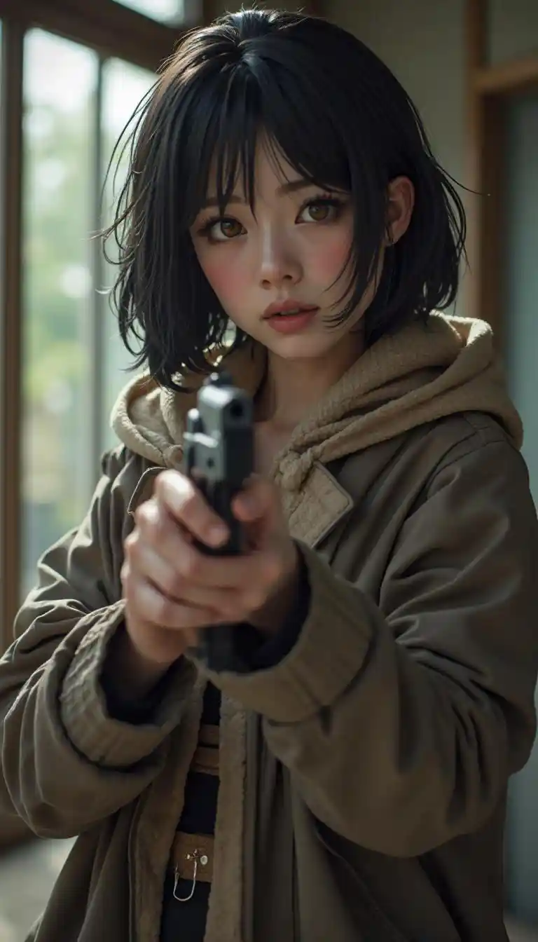 Emmabeautiful Japanese women, front view:1.331, sniper , hold up a handgun, anatomically correct 5 fingers, opposite, (8k, best quality, masterpiece), (realistic,