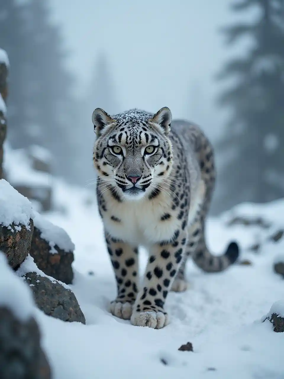 A National Geographic award-winning wildlife medium shot capturing a stealthy snow leopard in a snowy rocky mountain forest on a foggy day, its full body visible and covered in a dusting of snow. The image is highly detailed and high resolution, featuring the snow leopard looking directly at the viewer with an intense, predatory gaze. Its eyes are hyper-detailed, and the focus is crisp, capturing the natural lighting and serene yet powerful presence of the scene.