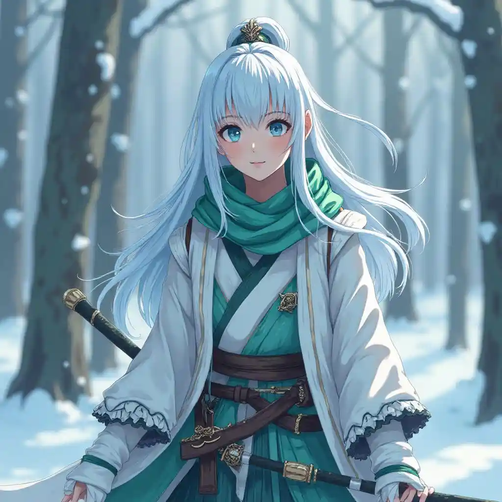 LincolnA beautiful white girl that has a icy hair and she has blue eyes that wear beautiful white and green fighting cloth and she has nodachi in hand in the snow forest with forest trees.