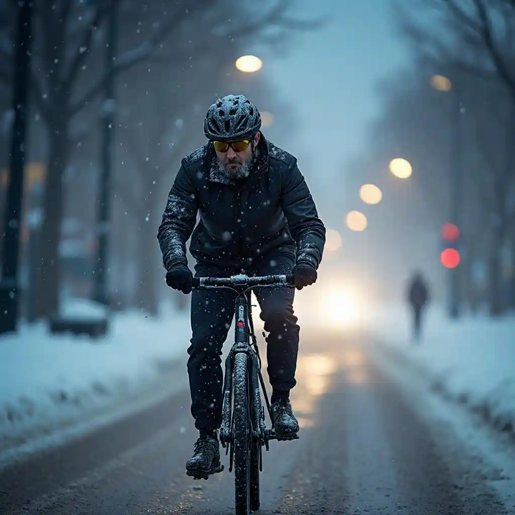 A cyclist rides through a snowstorm. The snow and wind blow into his face. Light effects are visible. Street lamps illuminate the scene. The photography has a very atmospheric effect, like in a movie. Many precise details can be seen.