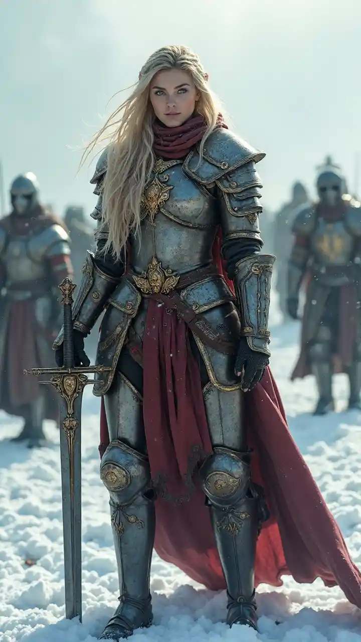 : "In a snow-covered battlefield, a valiant warrior stands tall, clad in intricate medieval-style armor adorned with gold and red accents. The warrior's long, flowing blonde hair cascades down her back as she grips a gleaming, ornate sword in one hand, ready for battle. Behind her, a legion of armored allies prepares for the impending conflict, their figures barely visible through the swirling snow. The atmosphere is tense, with a cold wind howling through the air, carrying the distant sounds of
