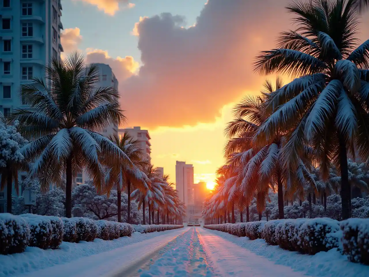 DanielSnowy Downtown Miami sunset in the winter time. Palm trees with snow on the leaves.