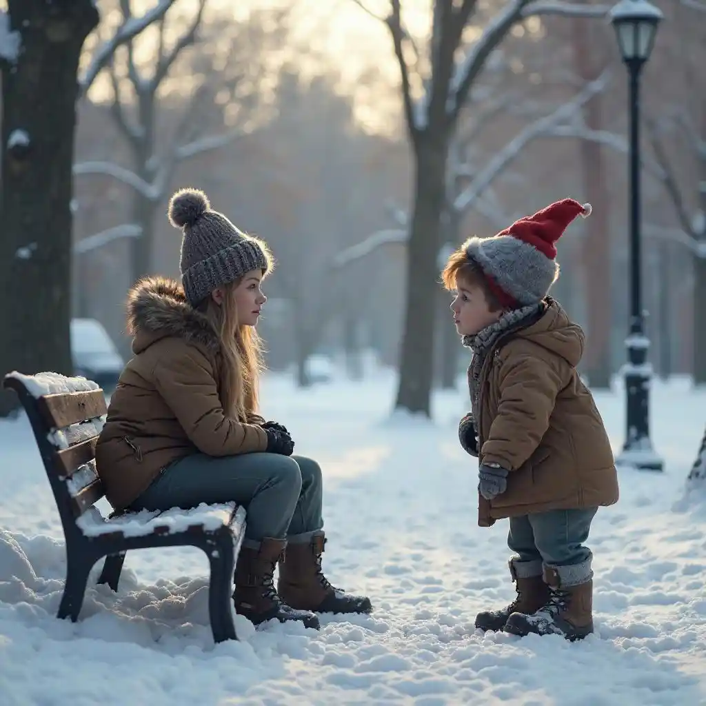 The picture shows a scene in a snowy park in Boston. A very beautiful girl is sitting and feeling sad, and a dwarf guy, not very attractive, passes by and wants to cheer her up.