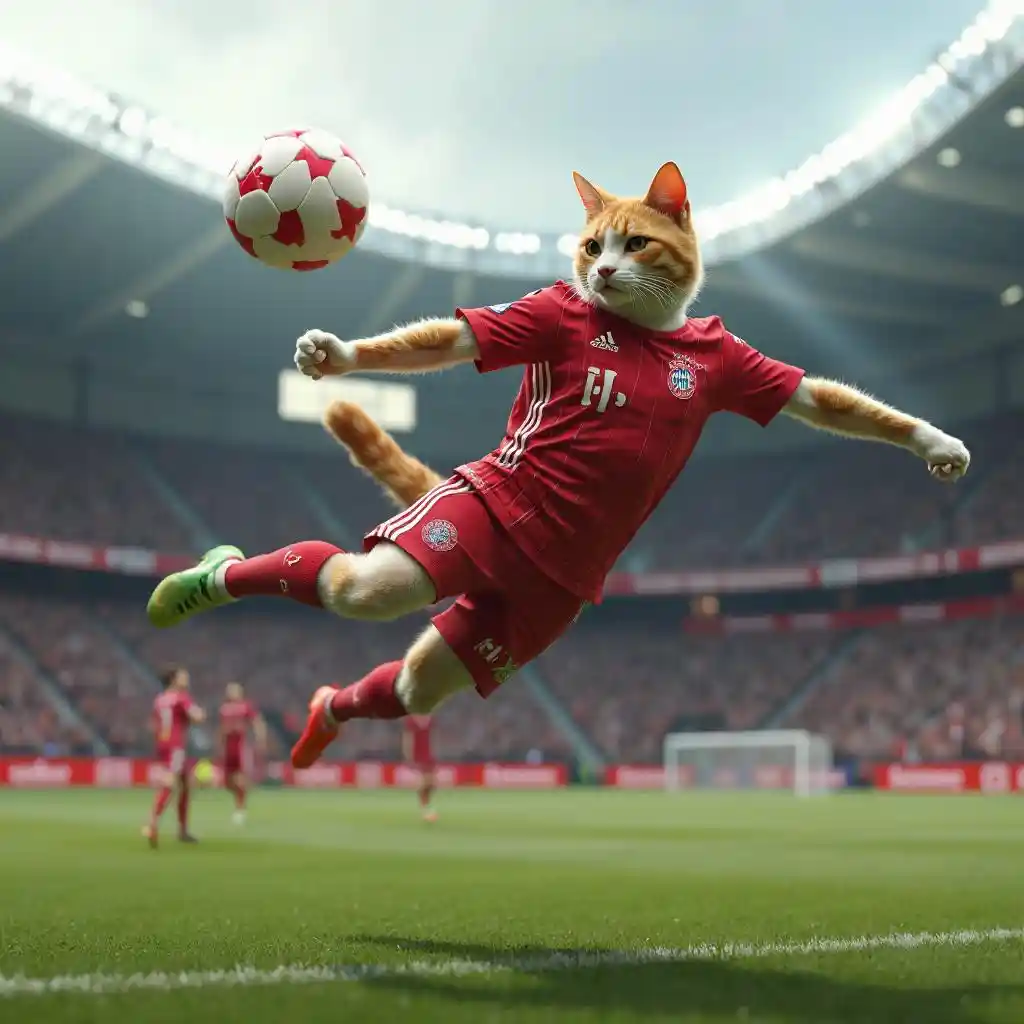 RoyCat doing a bicycle kick in the stadium wearing a Bayern Munich jersey in a realistic way