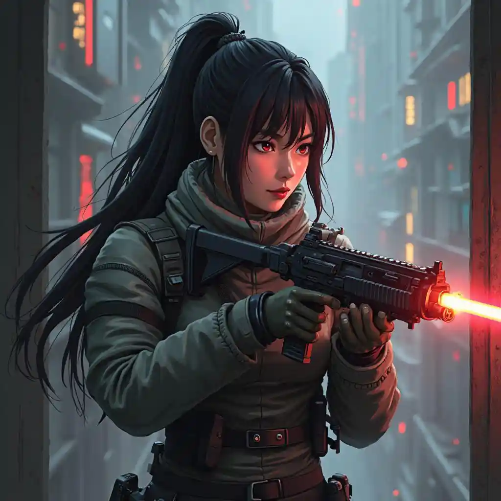 Calebcharacters are female soldiers locked on with lasers, A beautiful armed Japanese woman. , solo, With a machine gun, She has infiltrated an enemy fortress. , D