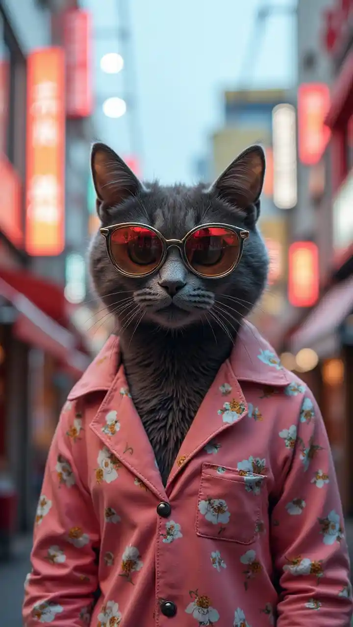 sophisticated grey cat in luxury bright pyjamas and sun glasses with tokyo street in the background. Colourful neon signs in the background.