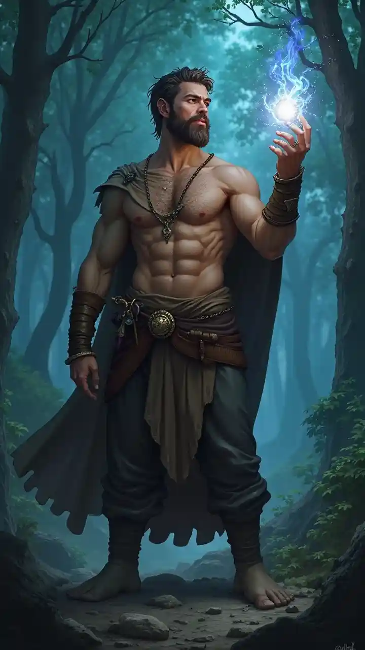 A Powerful Stocky Sorcerer Casting Spells in Nature