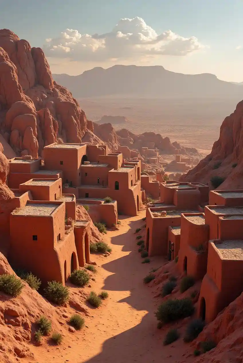 Adobe settlements of the Southwest, blending seamlessly with the red desert landscape.