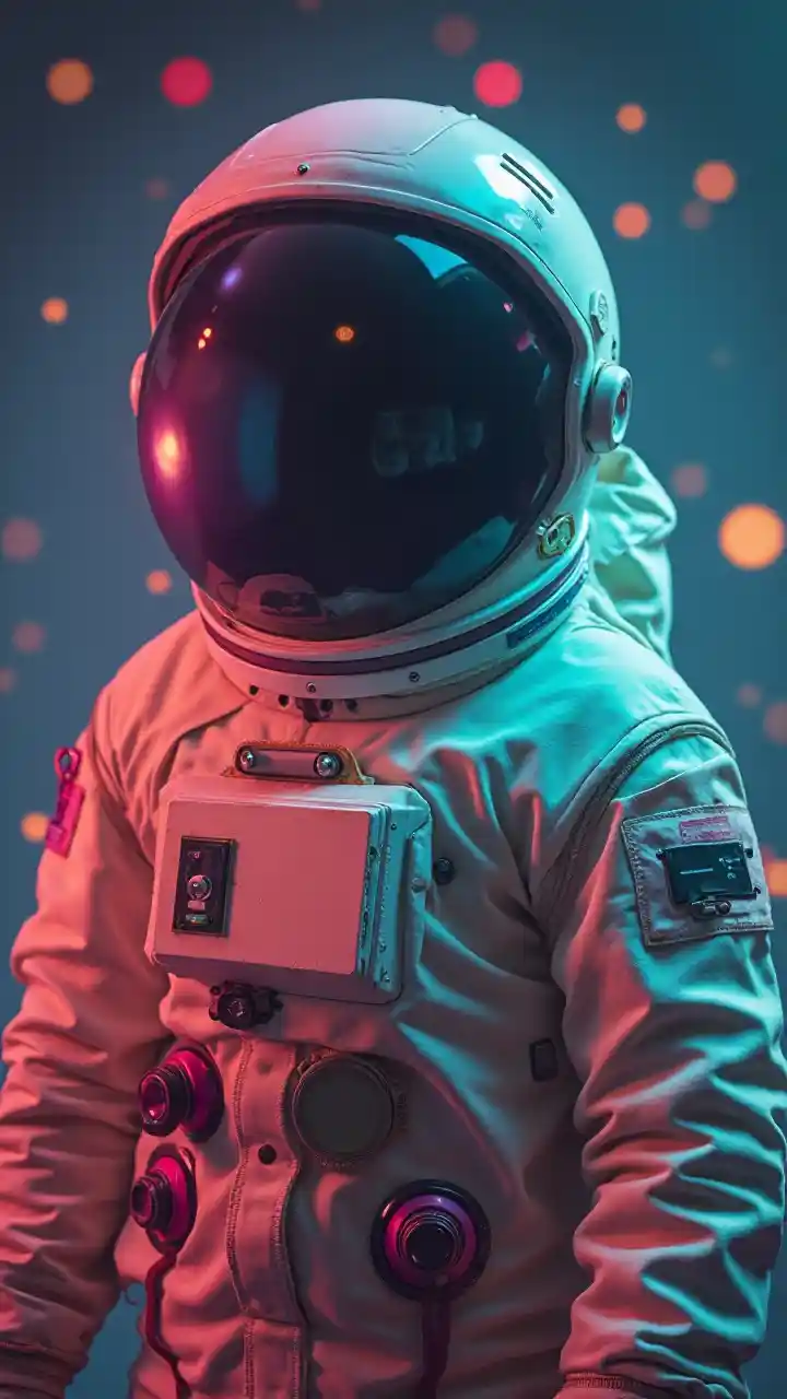 movie still, photo of an astronaut with no face, Rainbow asteroid, light indigo, neon pink and dark beige, muted tones