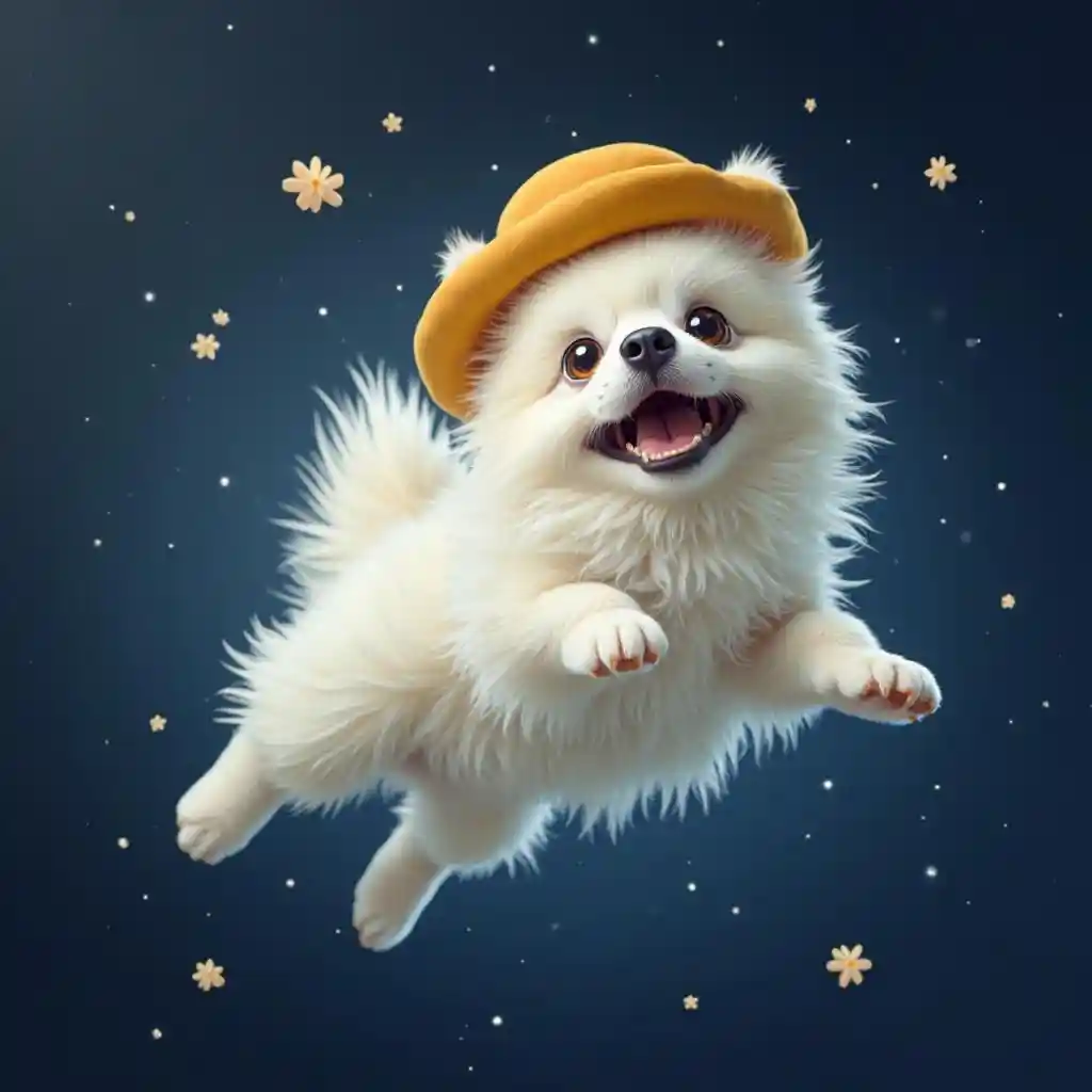 A white pomeranian dog floating in space with a yellow hat on