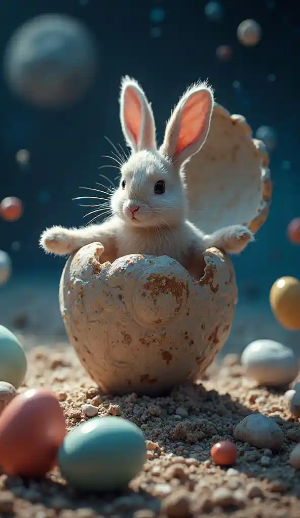TinaMultiple Easter eggs floating in outer space、A space princess rabbit breaks out of the shell and appears from one