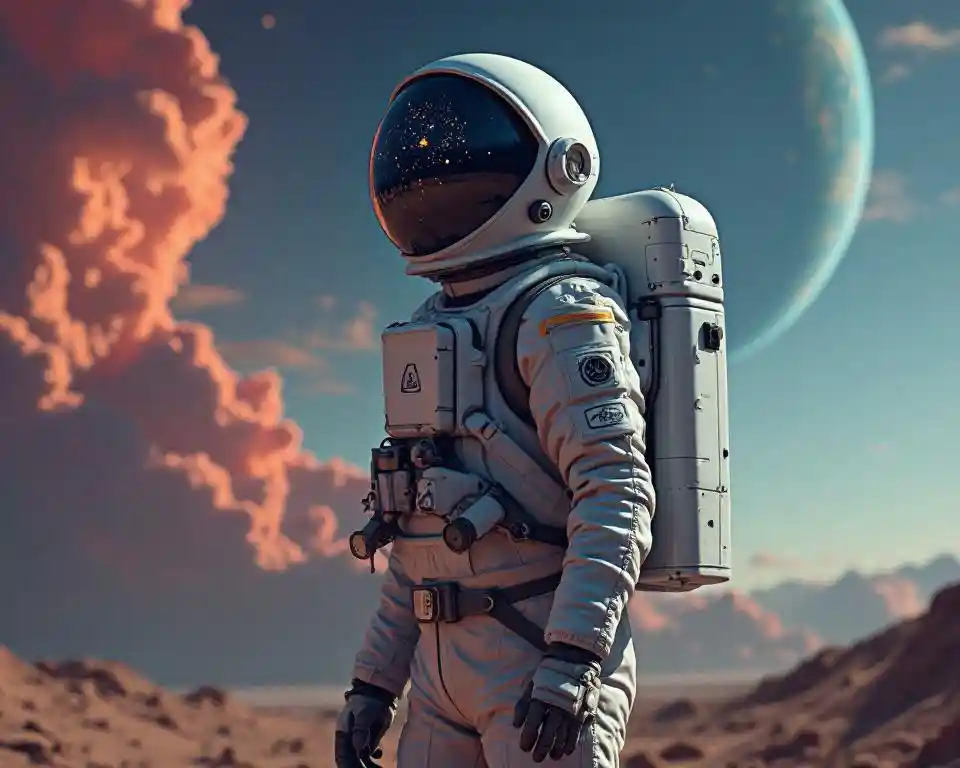 JocelynAn astronaut human with futuristic space clothes, a transparent helmet with a stars. He landed on a planet. With the background of the planet and colorful nebul