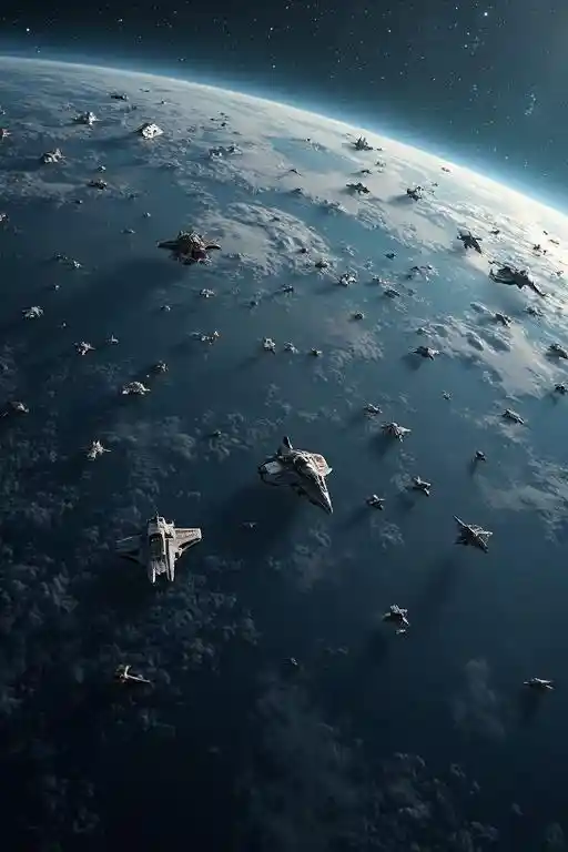 Skylar"A view from space showing Earth in the background, surrounded by thousands of interstellar ships of different shapes and sizes, all heading off at the same tim