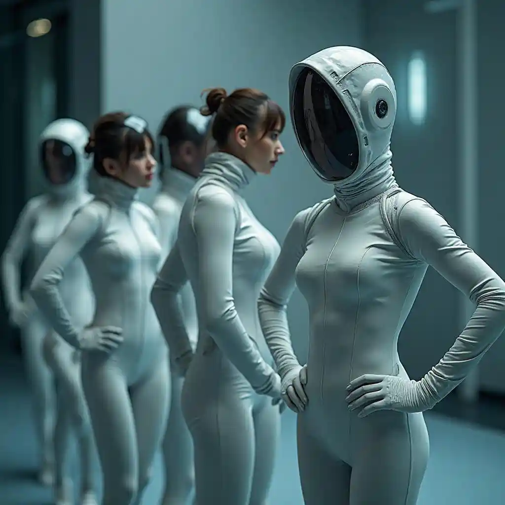 Cinematic scifi photo, photorealistic masterpiece of several young slim women and men (((completely covered by a sleek, form-fitting closed space suit))), compl