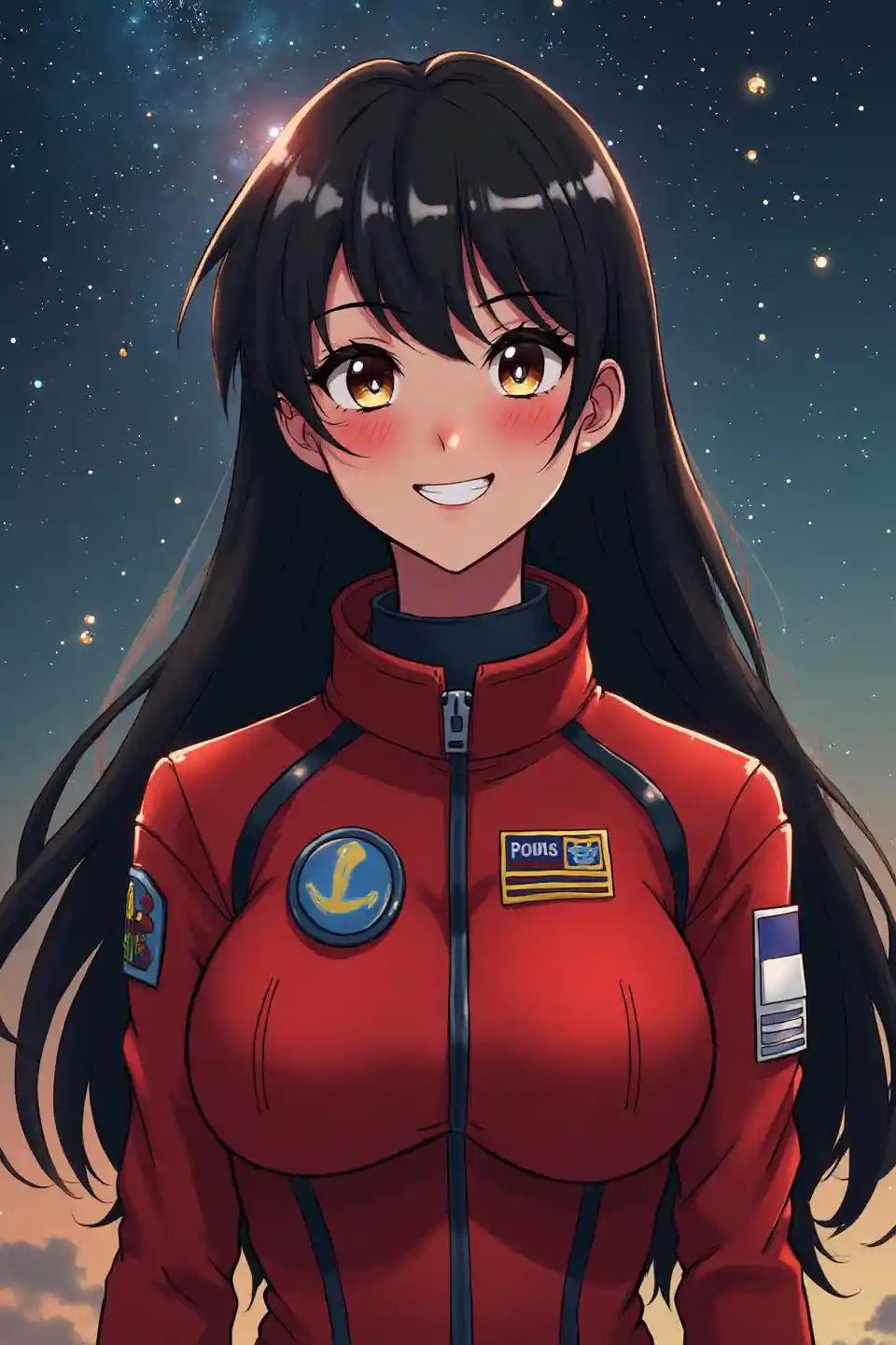 high quality, universe, space suit, I can see the stars, red, black, haired woman, smile, blush, show teeth, big breasts,