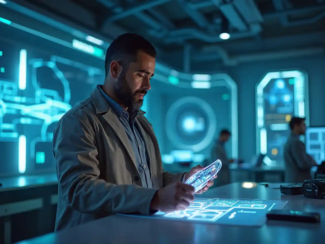 Designing a spaceship in a high-tech lab, a Middle Eastern man in his 40s glows in a sleek jacket. Glowing blueprints and holographic models frame him, his focused innovation and sharp intellect radiating cutting-edge prowess in a futuristic, sterile environment.