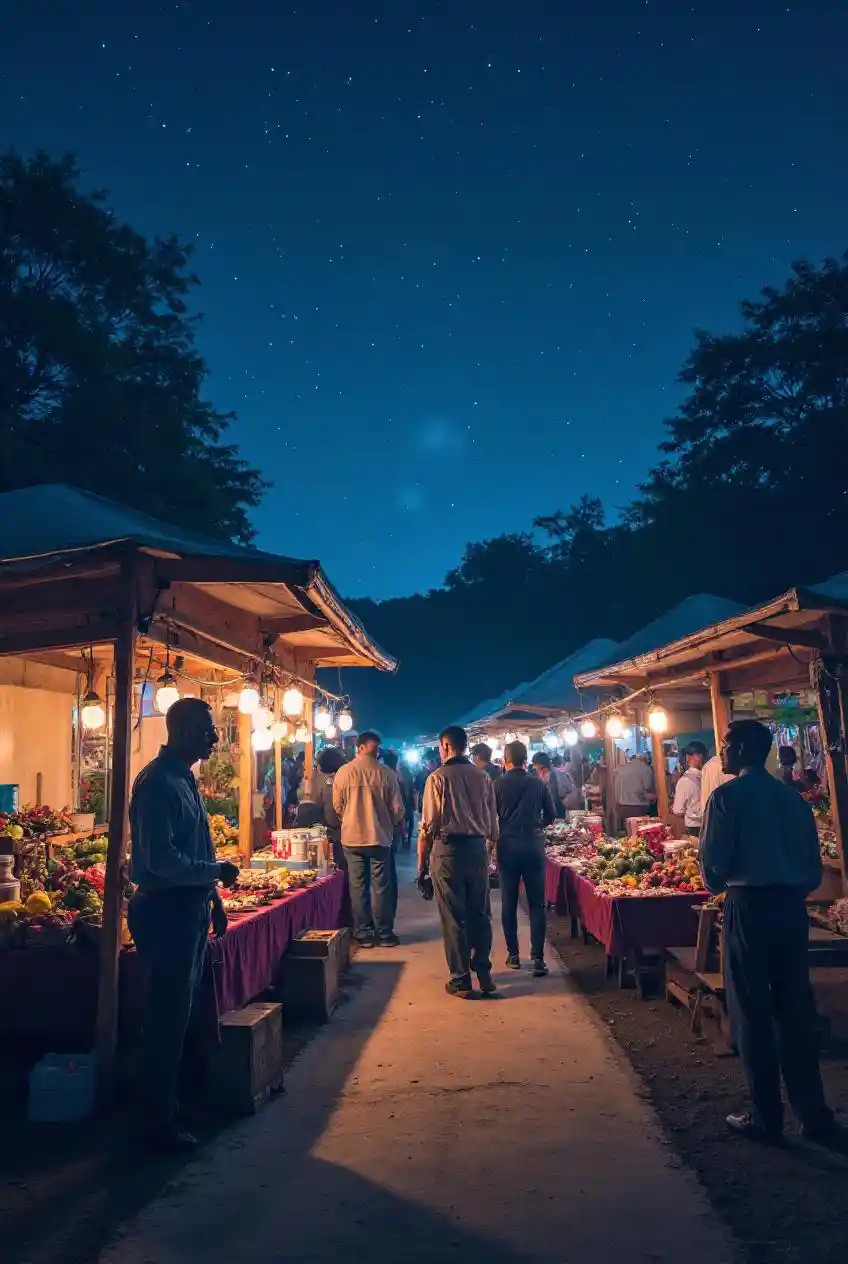 Night market under a starry sky, spirits peddling wares, echoing spirited-away vibes.