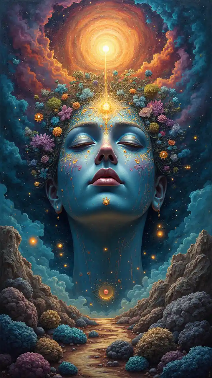 Surreal spiritual artwork representing deep self-understanding with rich colors and vivid details