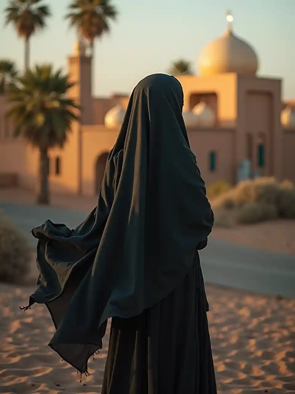 A Great Muslim Woman in Full veil her Veil waving around randomly as air forcing it , The woman backview , Some orange blue black hues and glows in the background of woman , Woman standing opposite to Mosque in Madina , Desert , palm trees , Very Muslim Spirtual Woman .
