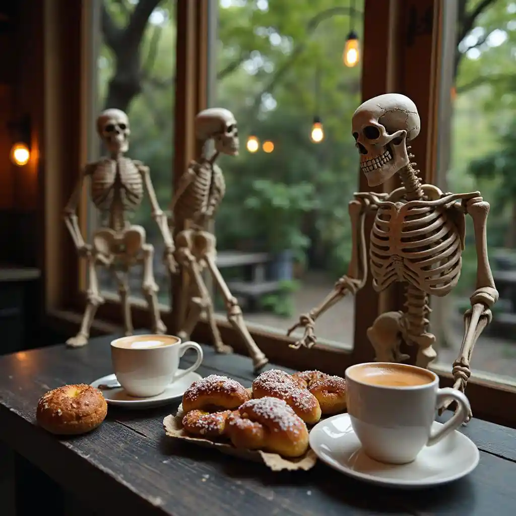 LunaSkeletons celebrating Halloween in a coffee shop Garden with American coffee and capuccinos and bread or donuts
