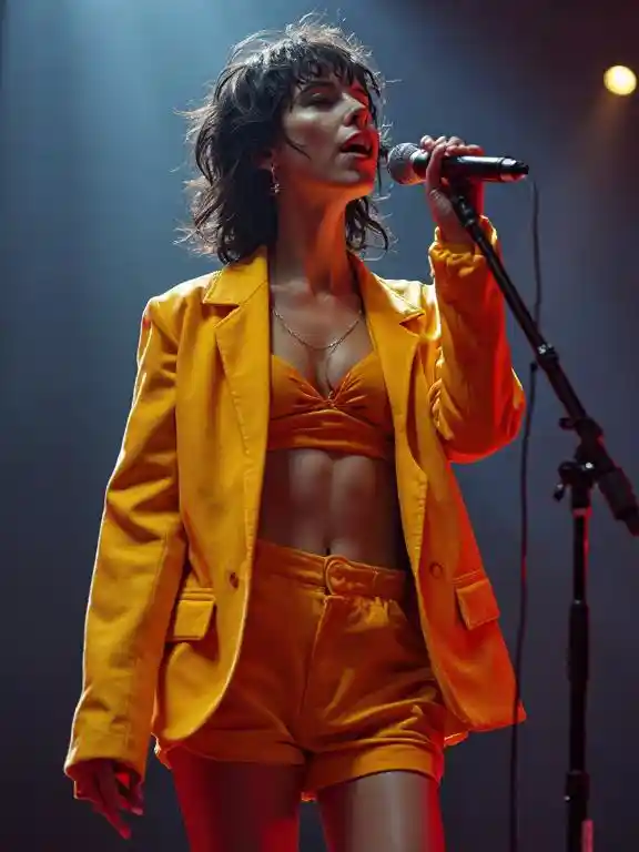 KinsleyHigh definition , better quality , a woman with short dark hair sings a song on stage , high, bright jacket , disheveled hair, bright jacket , shorts