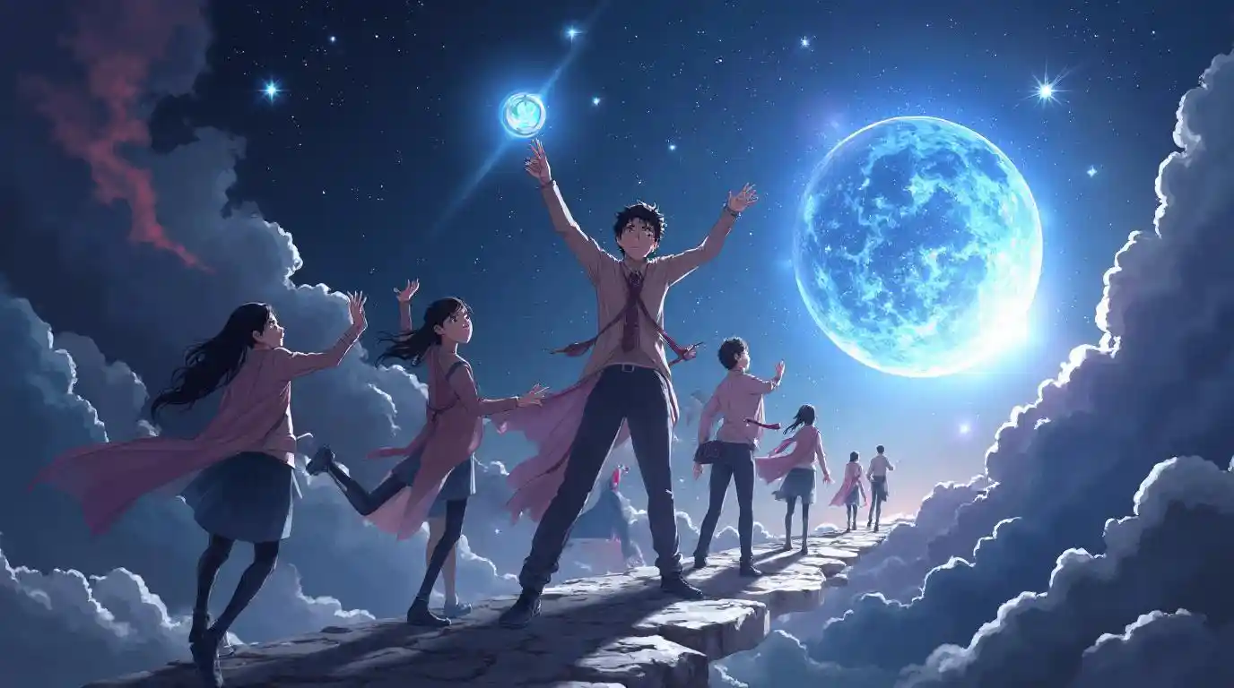 Bustling academy in a meteor, students harnessing star magic, resonating with cosmic anime themes.