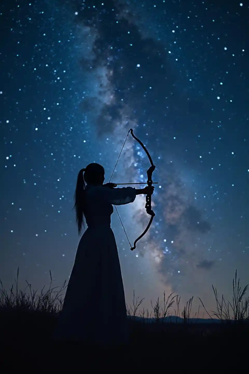 Silhouette of a woman with a bow shot by the stars of space, beautiful night sky, Magnificent natural scenery High definition,Masterpiece,realistic,Like the pic