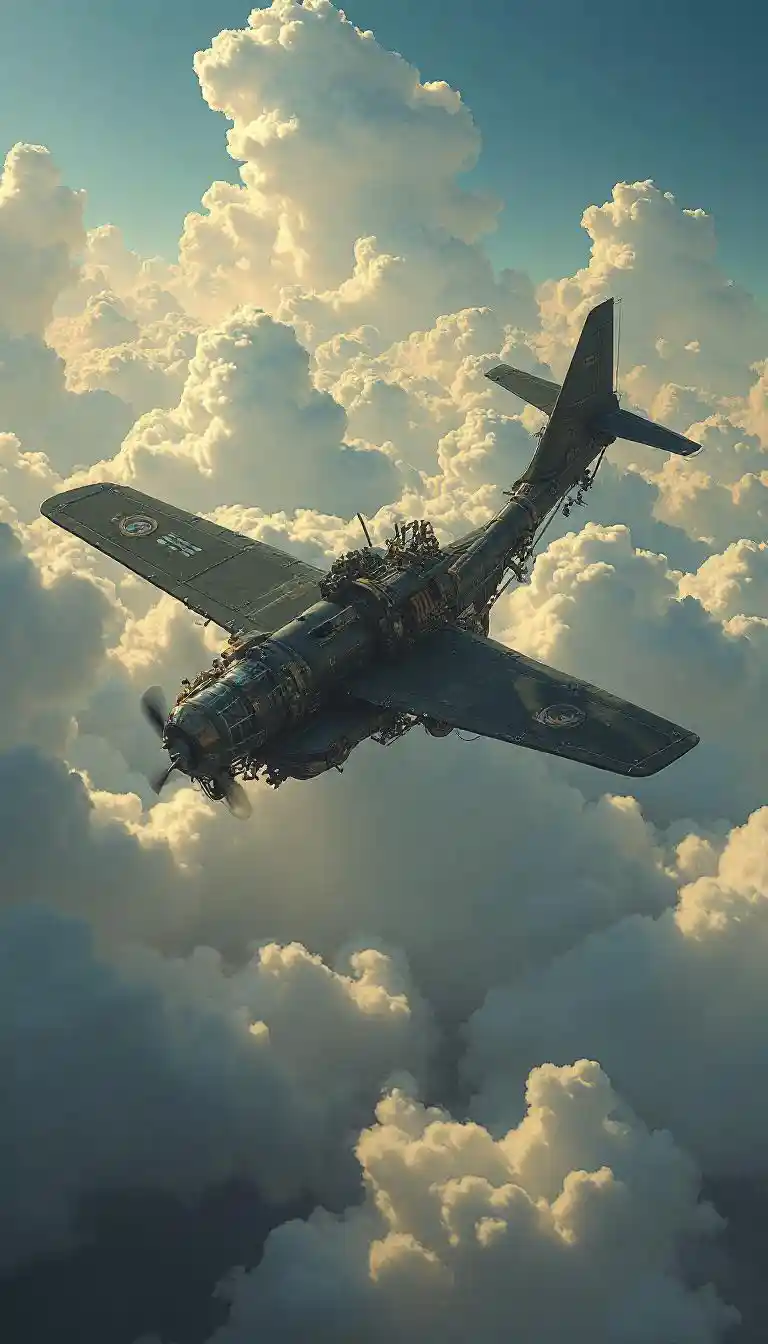 GiselleSteampunk Airplane Flying Through Cloudy Skies, arcane concept art, Muspelheim, Steampunk Machine, Celestial Adjuster, Dan Mumford Tom Bagshaw , Ascending