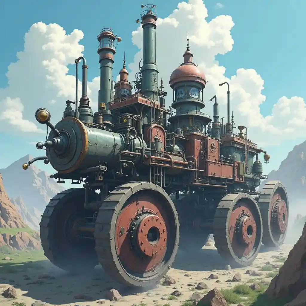 Mechanical city moving on colossal wheels, steaming engines, in a mecha-steampunk anime style.