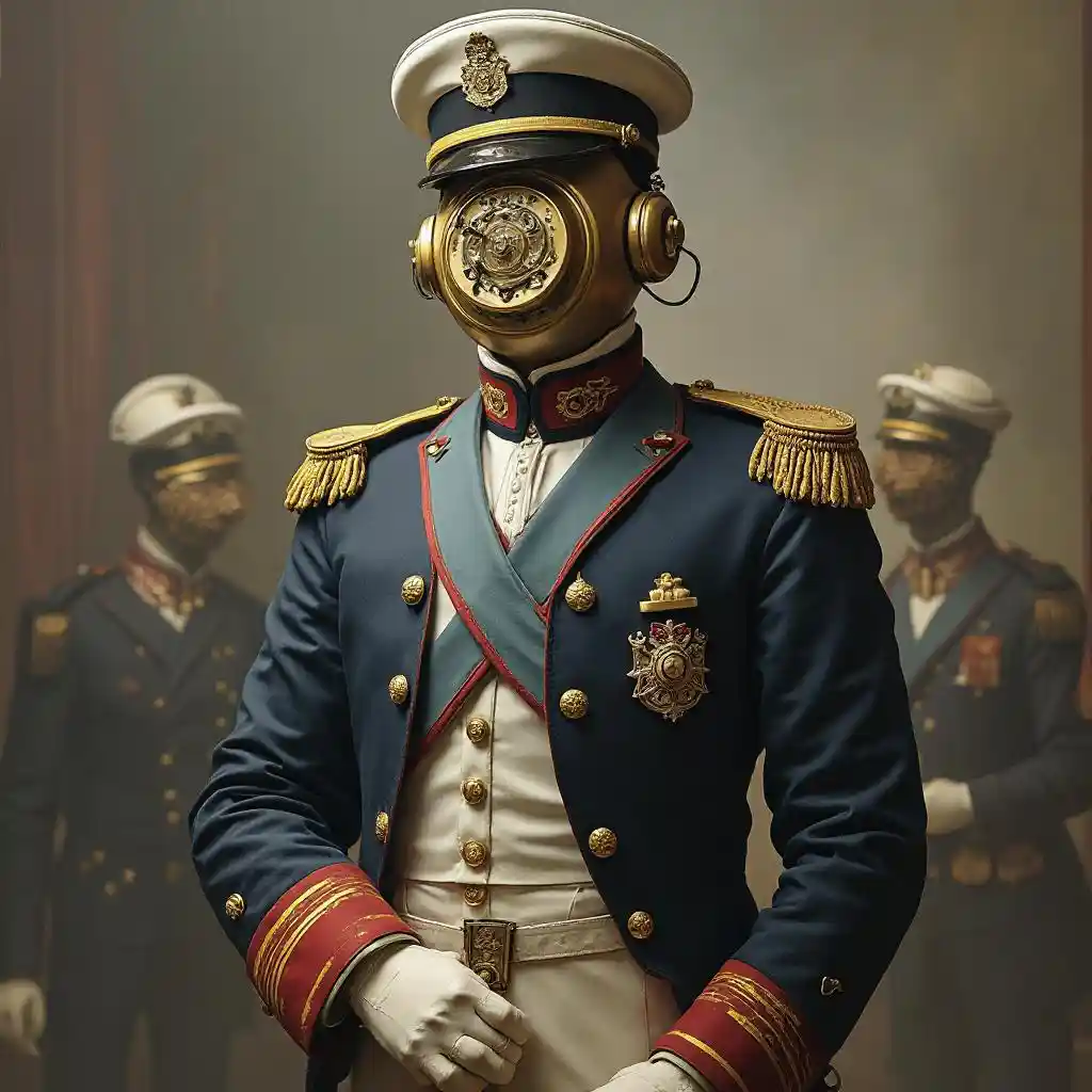 SophiaA digital collage of a Victorian naval officer with a stovetop for a chest and blender arms, eyes replaced by rotary phone dials, standing stoically amid a batt